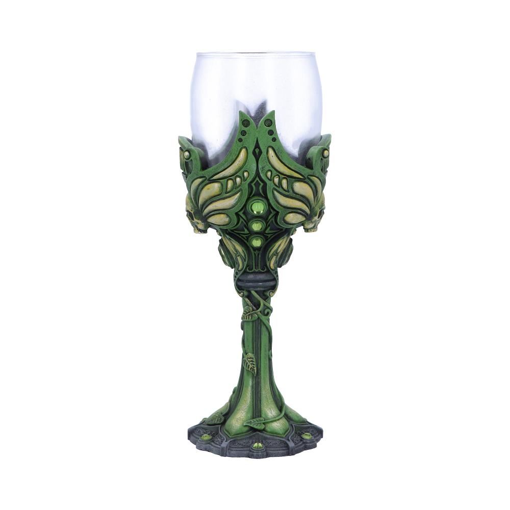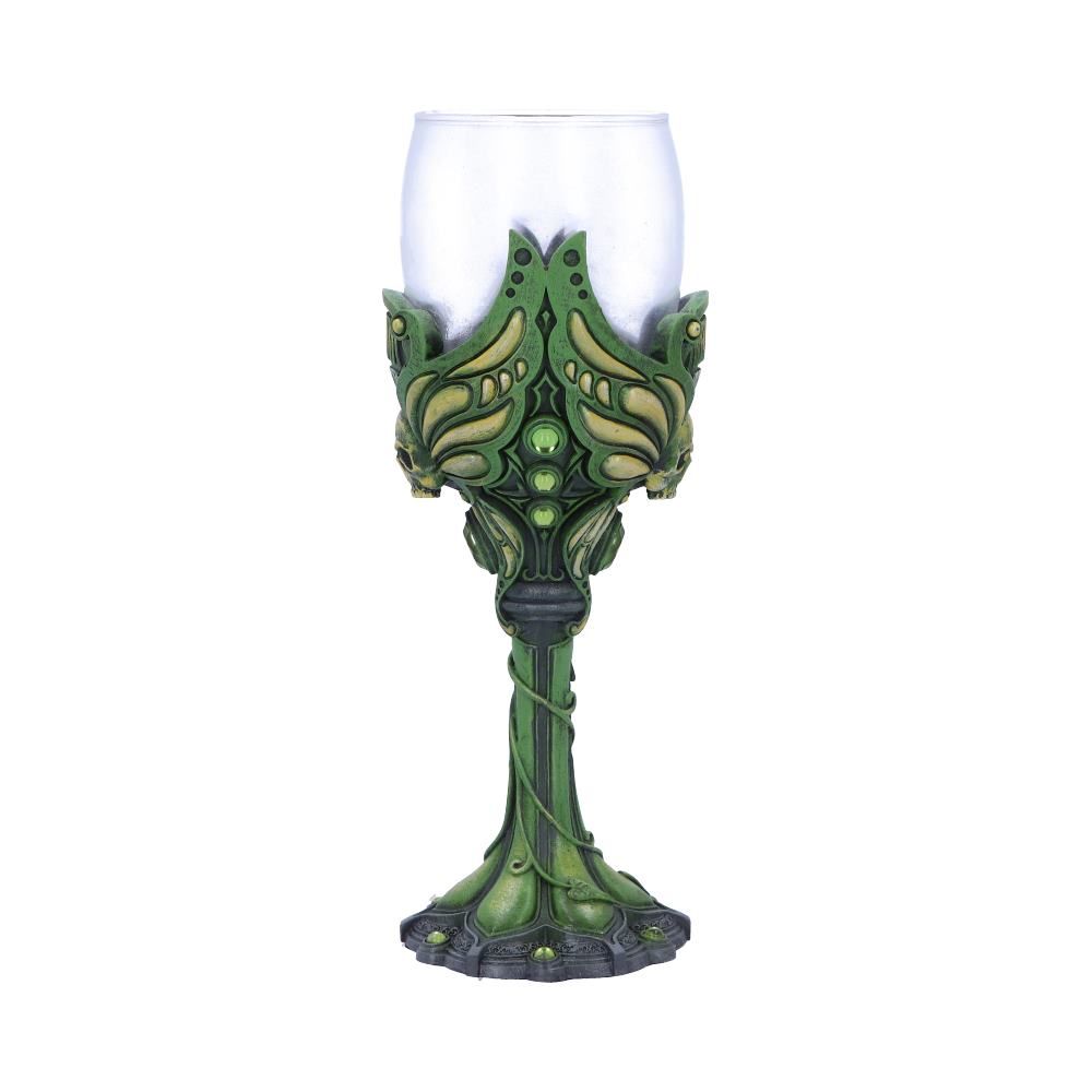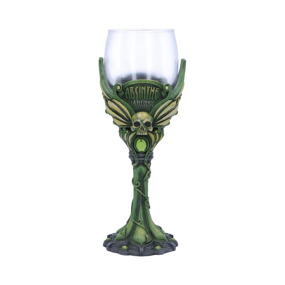 Absinthe Goblet: From the enchanting minds of our in house design team comes the Absinthe Goblet. Based on the green fairy of legend, the spirit of absinthe is embodied in this intricately designed goblet. Emblazened on the front and the back of the goblet is “Absinthe, la fée verte” when translated states “Absinthe, the green fairy” synonymous with Parisian and Bohemian culture. Beneath the sigil is the skull of the emerald coloured fairy spirit. From the sides of the skull a set of fairy wings emerge, enveloping the glass securely within them. The goblet is encrusted with emerald gemstones and ornate nisse detailing which continues from the base, up the stem and the circumference of the goblet. Created in collaboration with our creative team, this hand painted goblet will make the perfect addition to any sprite or spirit collection.