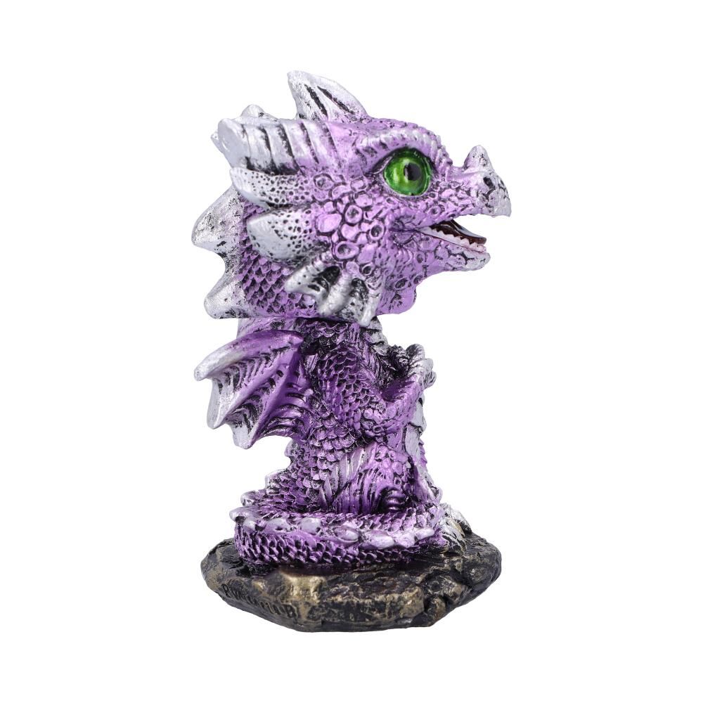 Purple Bobling: Bring a little quirky joy into your life with our Bobble-head range. Our collection of Bobling’s have a personality as unique as the colour of their scales. This Purple Bobling is perching on a rock with one hand on its knee and another pointing ahead, with its mouth gaping, it’s almost as if it’s laughing at you. The cheeky little dragon has purple scales and golden accents on its horns, claws and chest. These Bobling’s would make a perfect addition to any dragon enthusiasts collection.