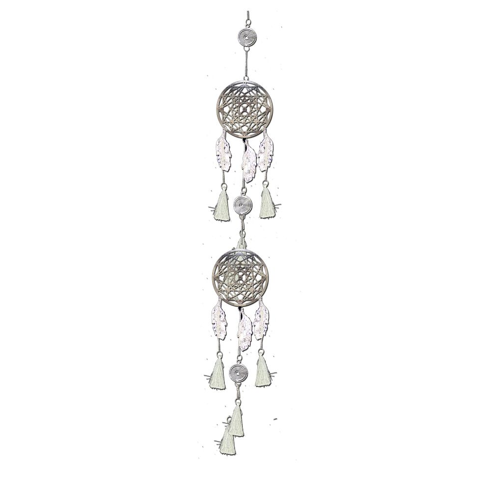 Available as part of Infinitum’s expanding Fantasy Giftware collection, this piece makes the sweetest music. A silver disc centred by an intricate geometric pattern adorns two stages of this chime. Followed by a mixture of metal feathers and white tassels, this piece makes the sweetest music when caught by the breeze.