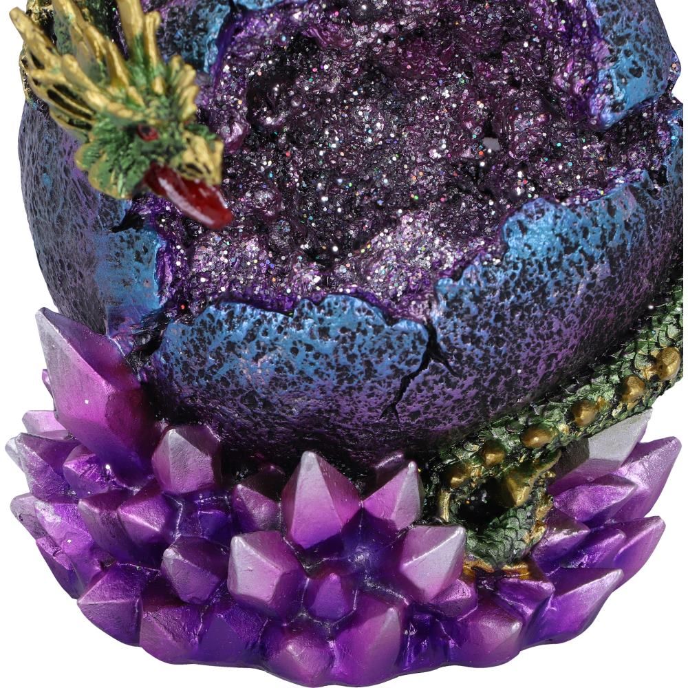 From the fantasy giftware collection of r Infinitum, this emerald-green Dragon clings to its sphere fiercely. With golden accents on its under-belly, wingtips and clawed feet, this beast is protecting all it owns from any enemy. The spherical perch has a crevice running across the front, exposing an amethyst geode and sits on a collection of purple crystals. Cast in the finest resin before being hand-painted, this monstrous piece will look perfect in any dragon enthusiasts collection.