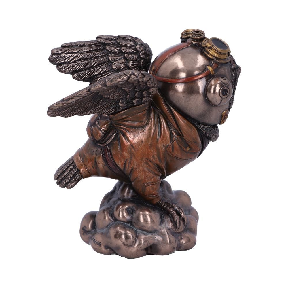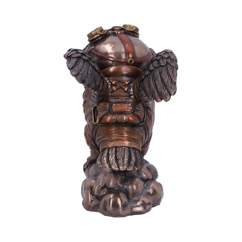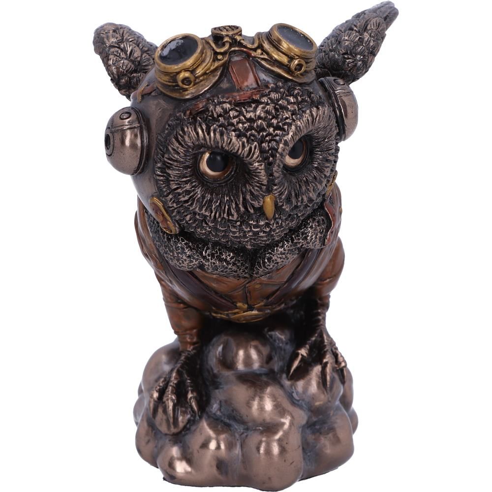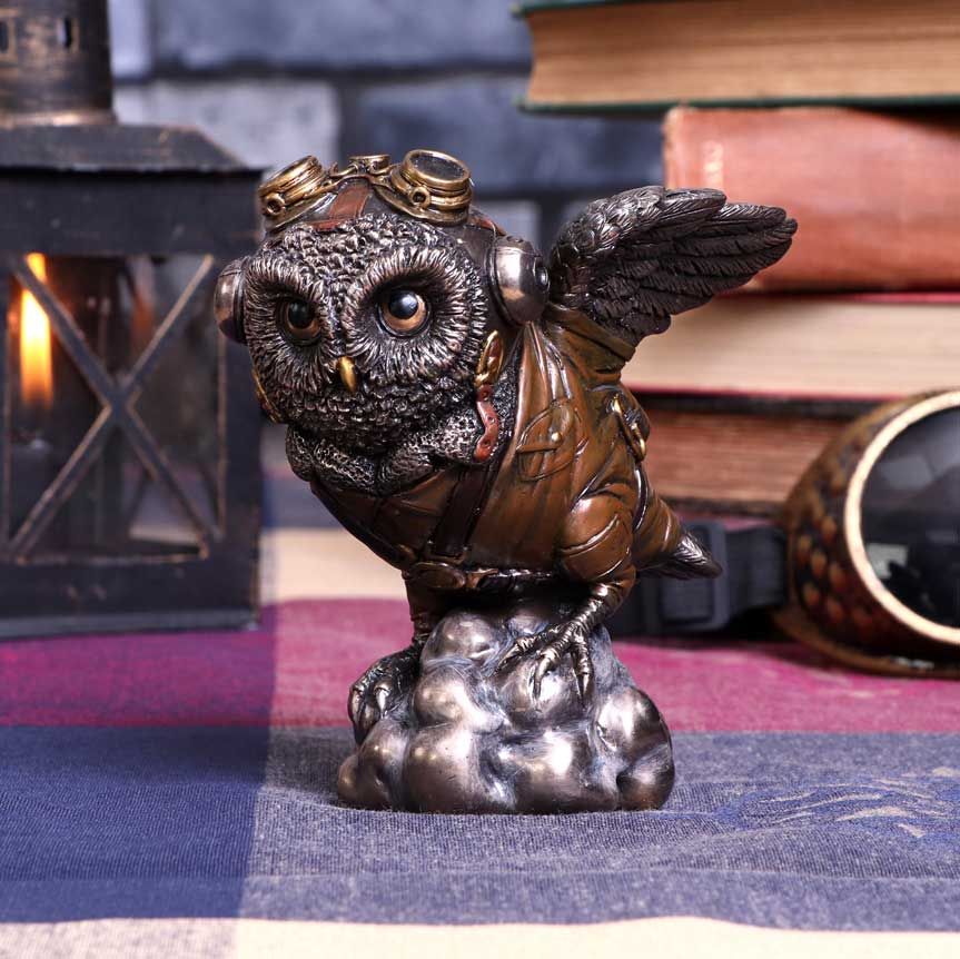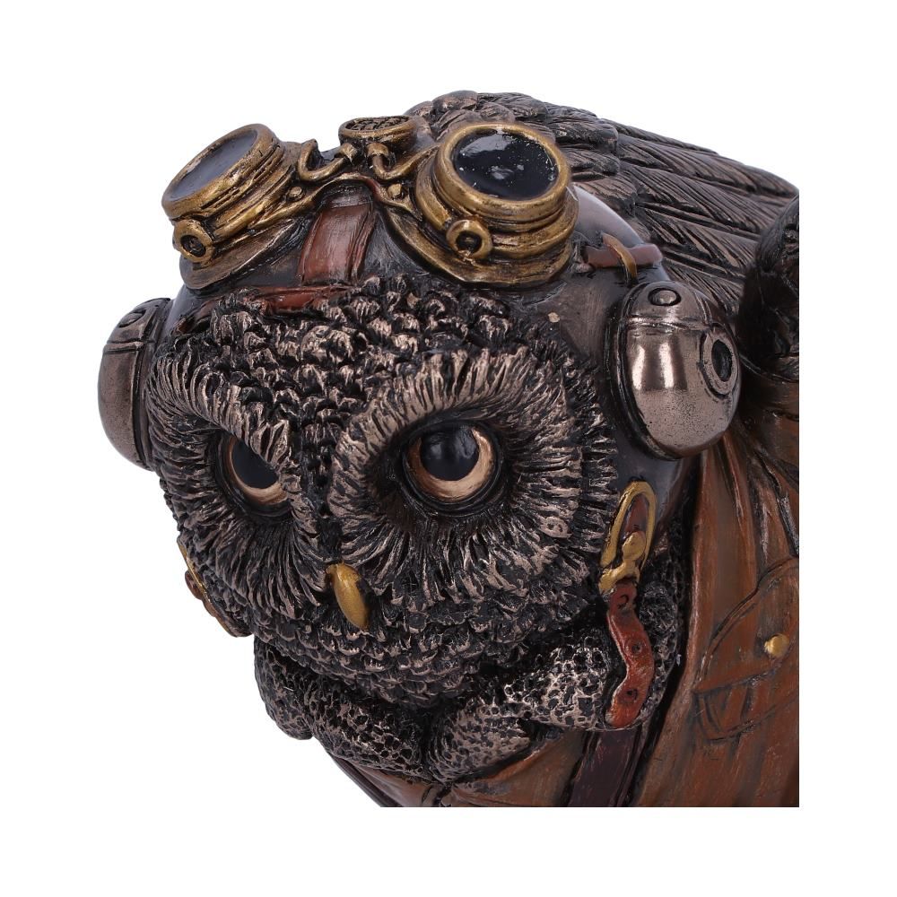 This adventurous little owl is prepared to take flight with leather aviation helmet, goggles, and boots he’s planned for every eventuality. The owl’s light eyes stare off to the side with razor focus, this little chap can certainly provide you with a birds-eye view. This steampunk-inspired figurine is cast in the finest resin before being painstakingly hand-painted, this item will look great on any bookshelf or mantel.