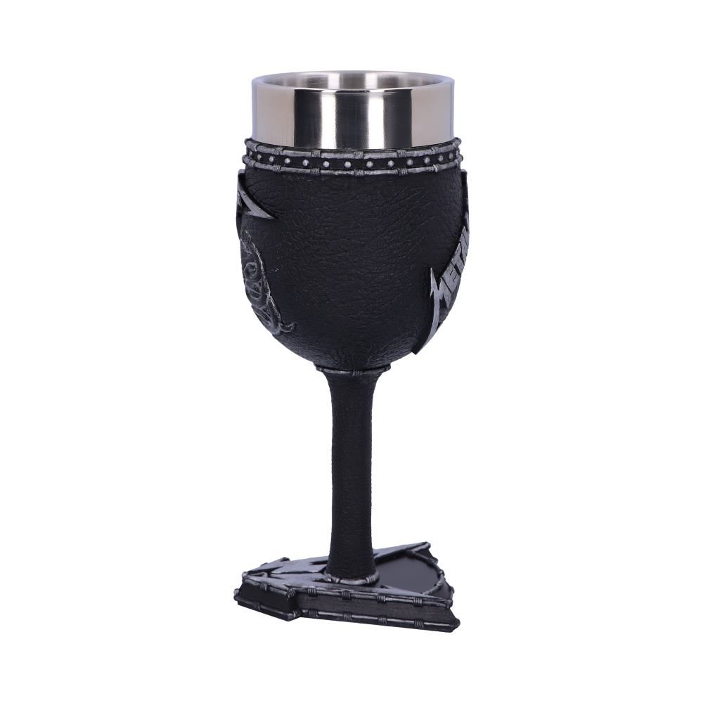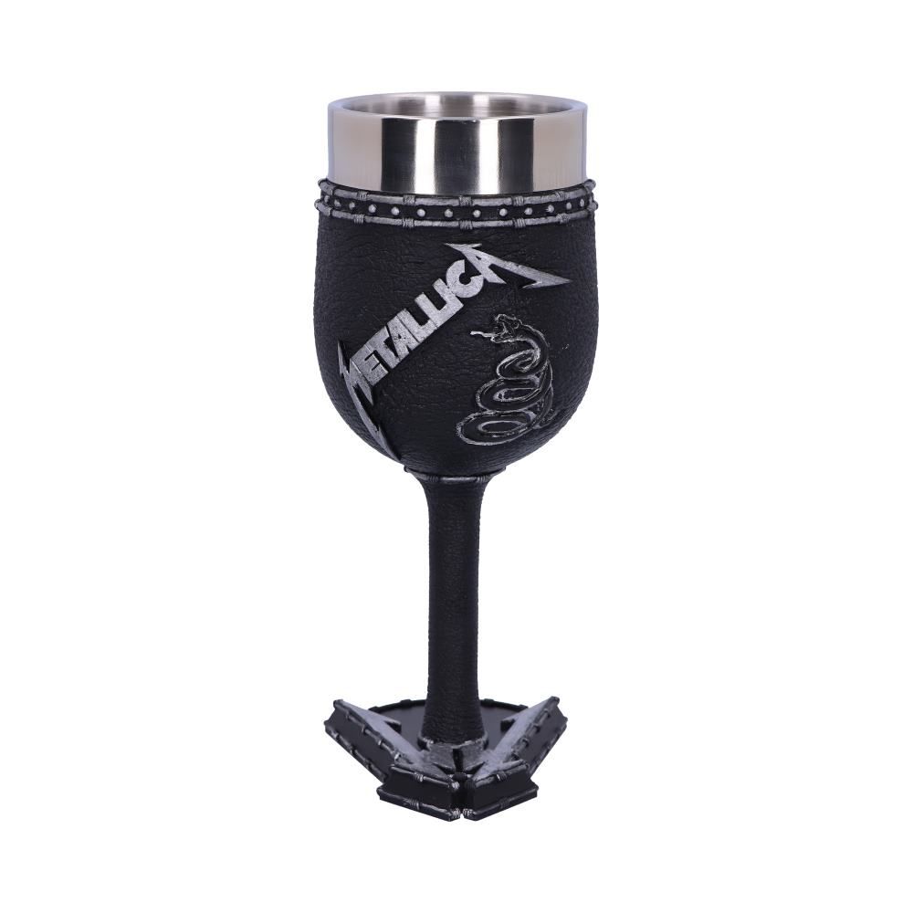 Have your favourite Metallica album artwork on display at all times with this exquisite Goblet, now through Infinitum! Featuring the understated artwork from their self-titled fifth studio album, the Metallica logo sits above a coiled snake on a black background. The “M” from the logo is mirrored in the foot of the Goblet stem, which is cast in the finest resin before being expertly hand-painted. This piece comes with a removable stainless steel insert and is the perfect way to pay homage to one of the most influential heavy metal bands of all time!