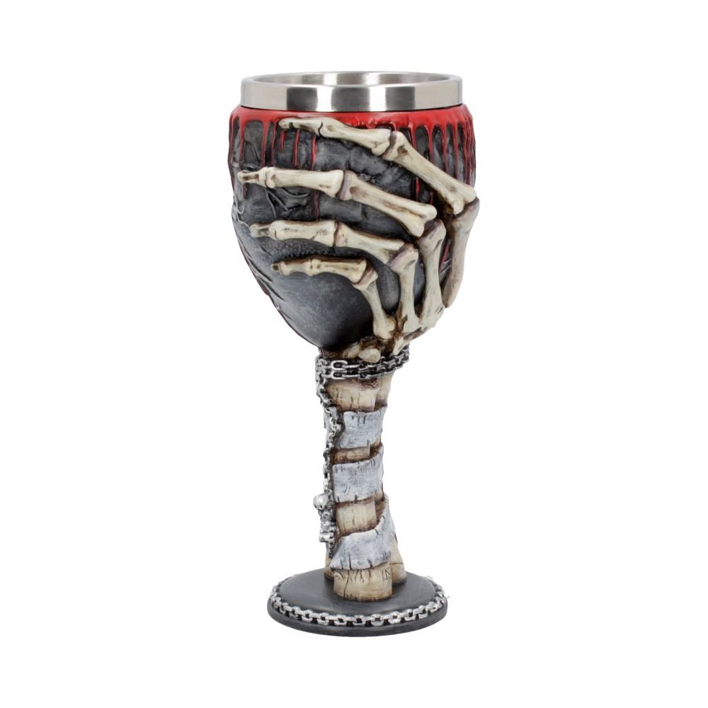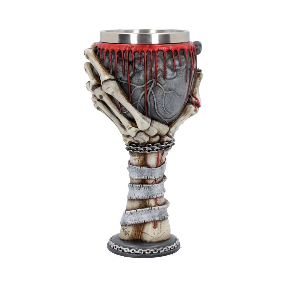 From the twisted minds of our in-house design, this gruesome Goblet is available now from the Giftware collection of Infinitum. Emerging from a chained base, a skeletal hand rises with a blackened heart in its grasp. Intricate veins and arteries are raised on the surface of the deathly heart yet fresh blood trickles from the rim, making the Goblet even more spine-tingling. Around the skeletal wrist a thick chain cascades, adorned with small silver cross, skull and heart charms. A small script twists around the bone structure and reads ‘My Black Heart Bleeds’. Cast in the finest resin before being expertly hand-painted, this Gothic Goblet has a removable stainless steel insert for ease of cleaning. Bring your macabre nightmares to life today!