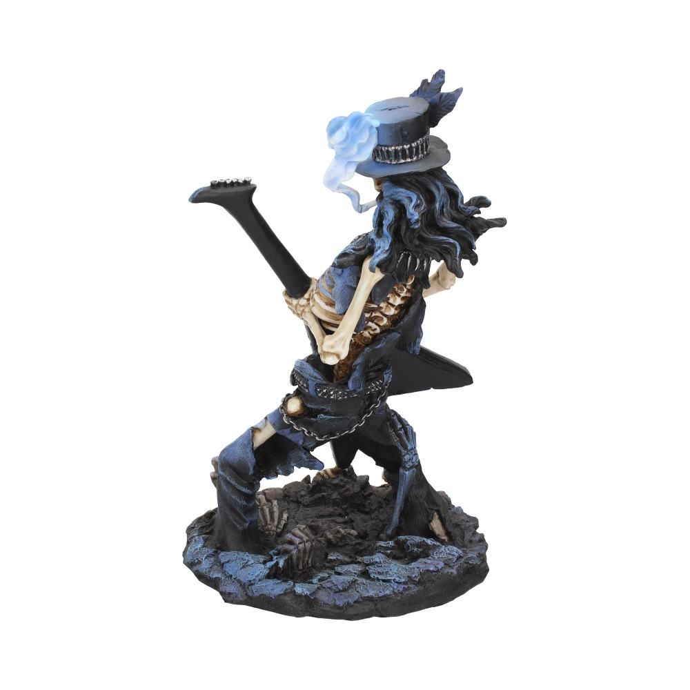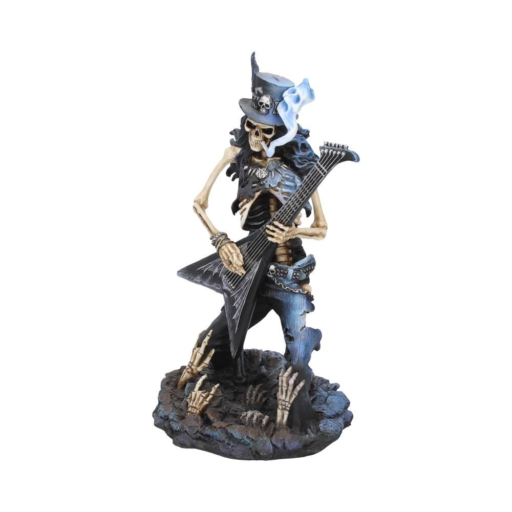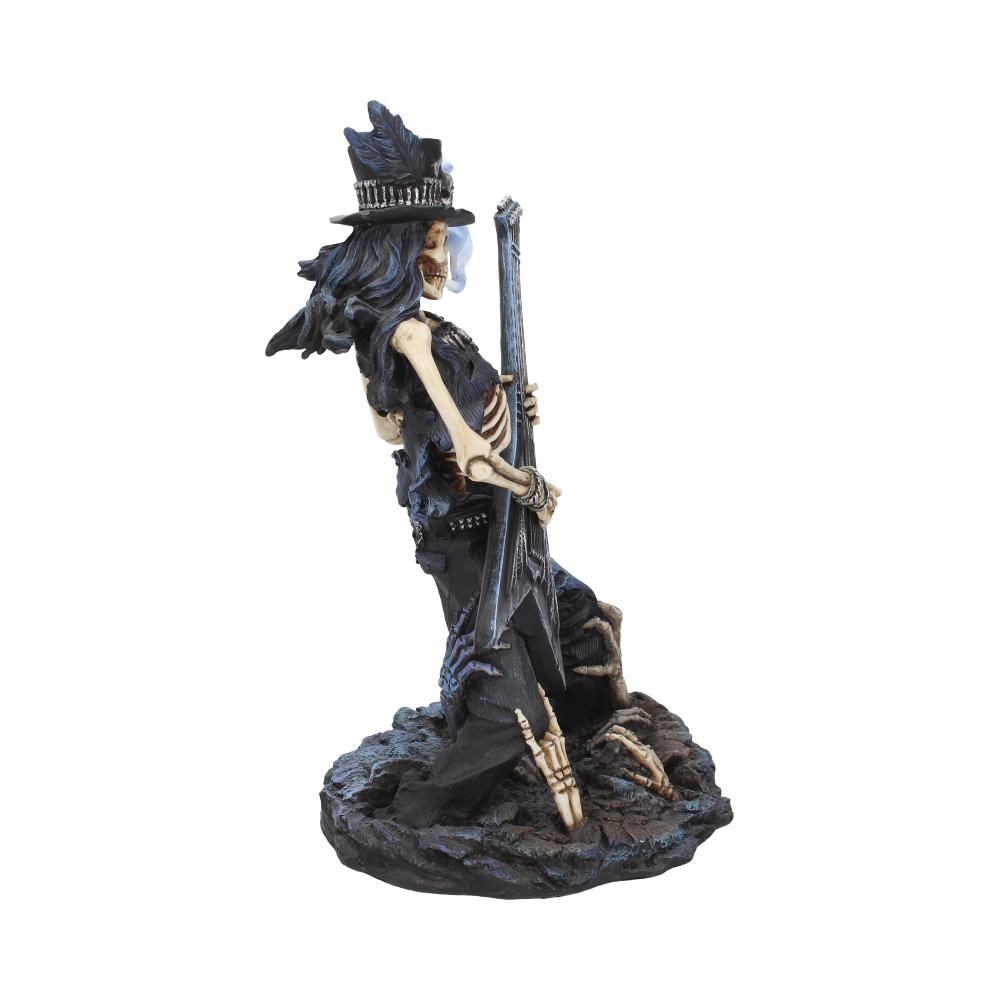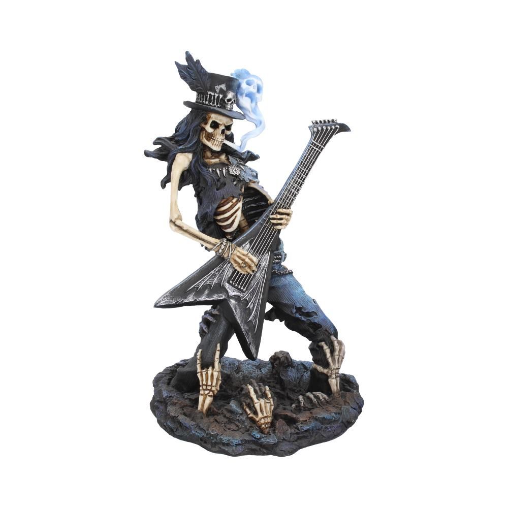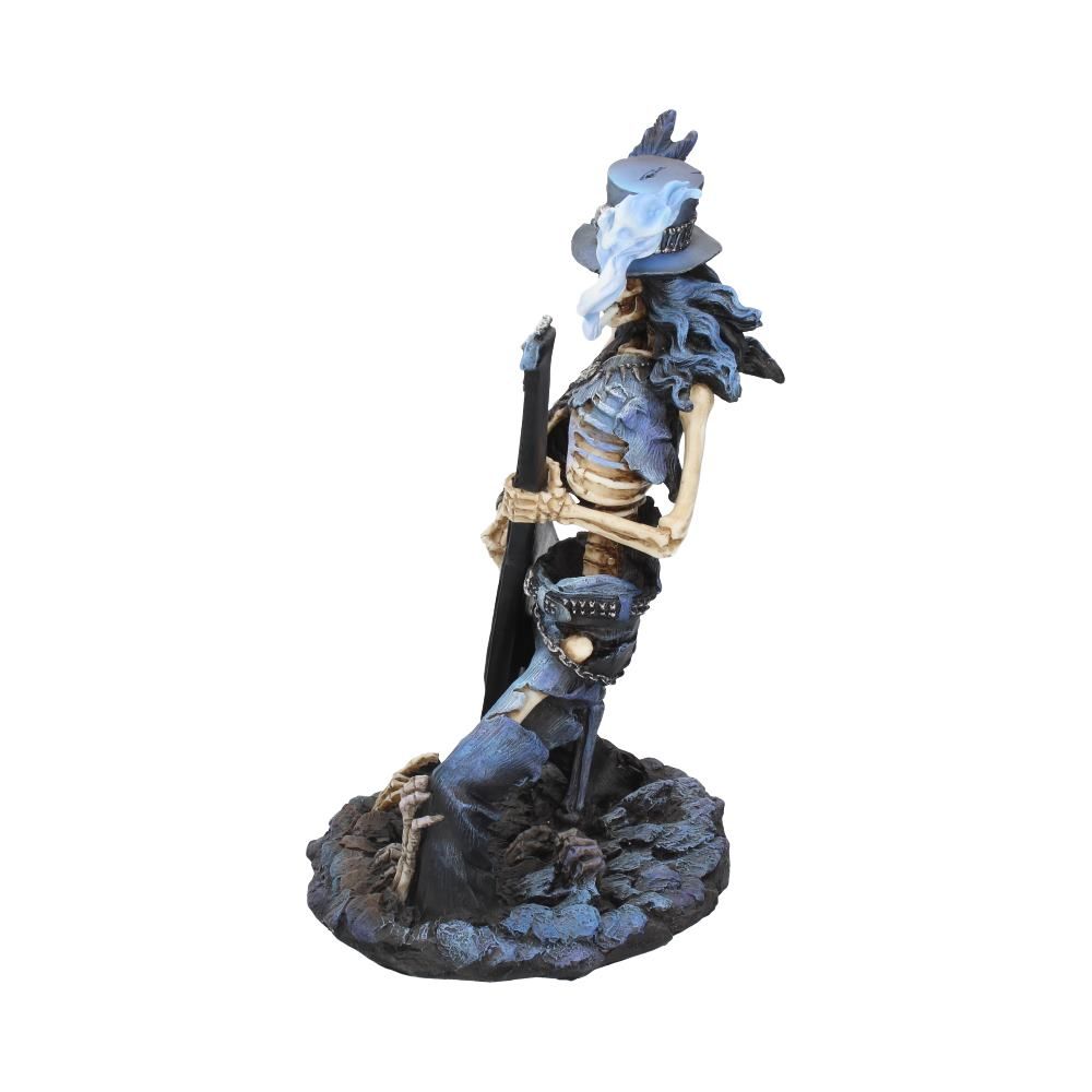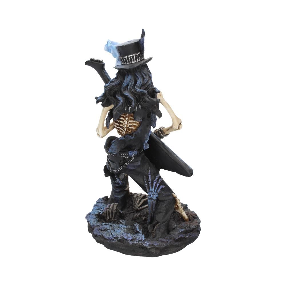 This hard-rocking piece is from the alternative artwork of James Ryman and now available through Infinitum. In a misty moonlit graveyard, framed by dead trees, this skeleton strikes a pose as they play on a black flying V guitar. Skeletal hands reach up from the ground, some grabbing at their legs, others making the sign of the horns in appreciation. Long black hair flows out from beneath their black top hat, and the hatband held in place with a silver skull holds a long black feather and an Ace of Spades. Their cigarette smoke curls upwards and forms a screaming skull, implying that they’re smoking someone’s soul. Cast in the finest resin before being expertly hand-painted, this piece would make any budding musician want to pick up an axe and play!