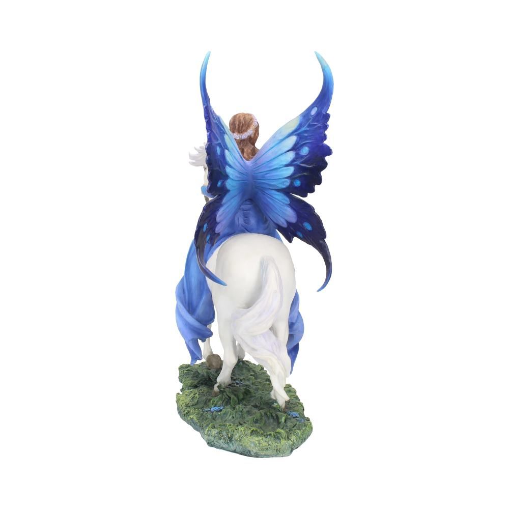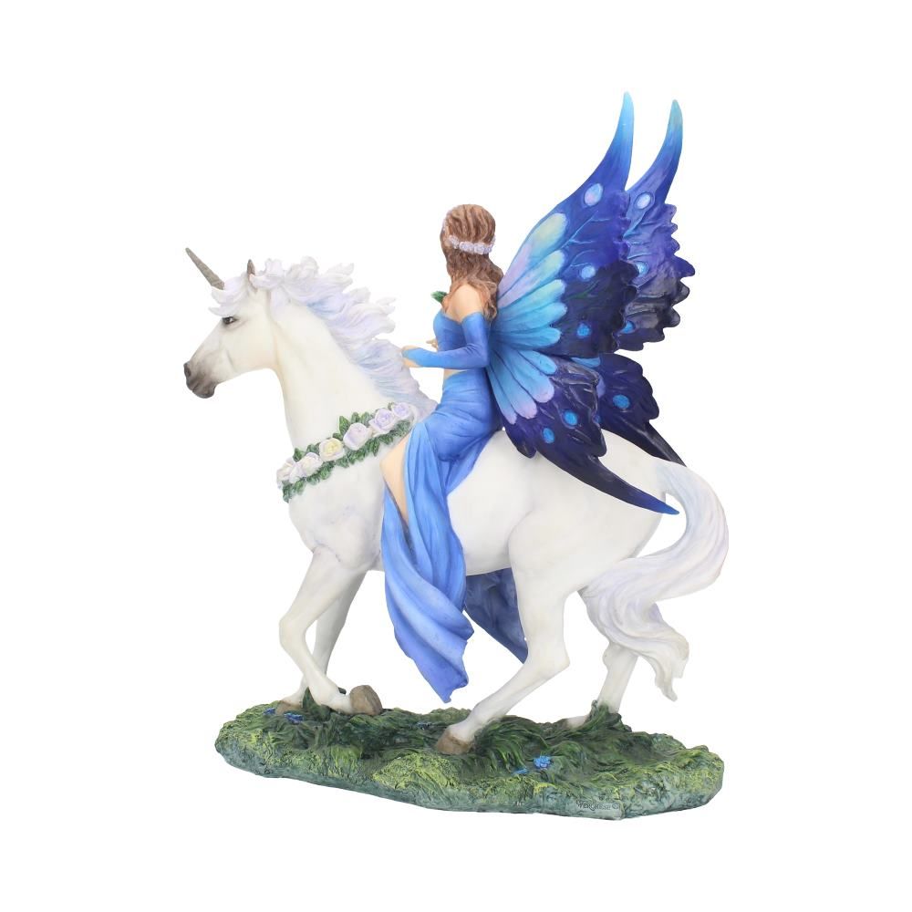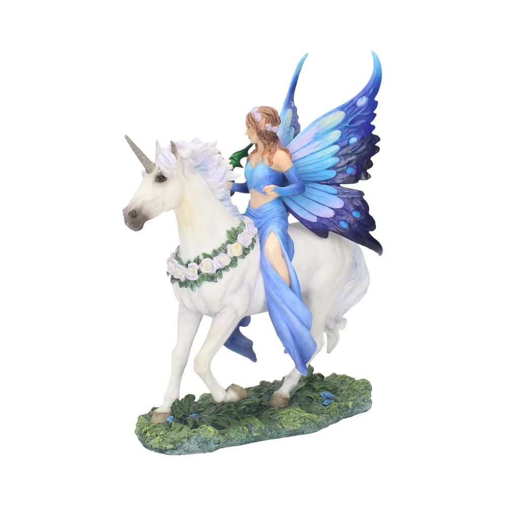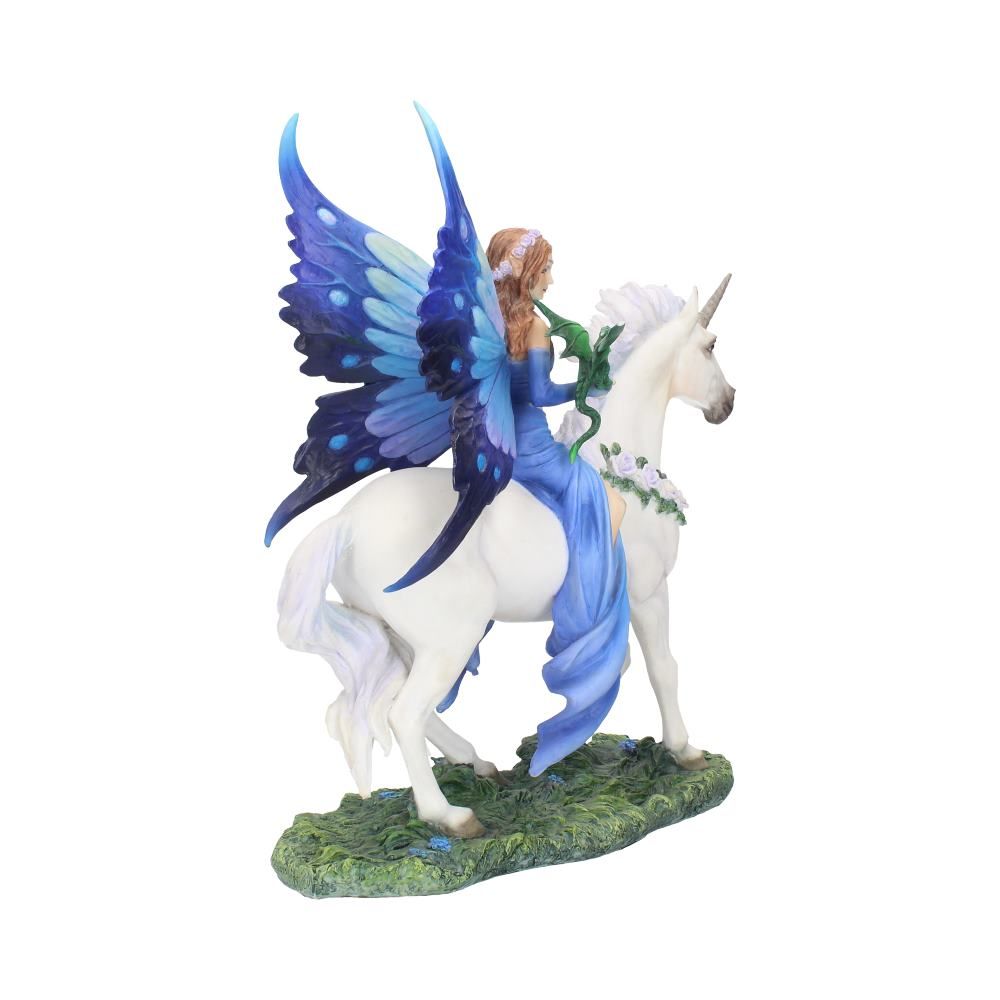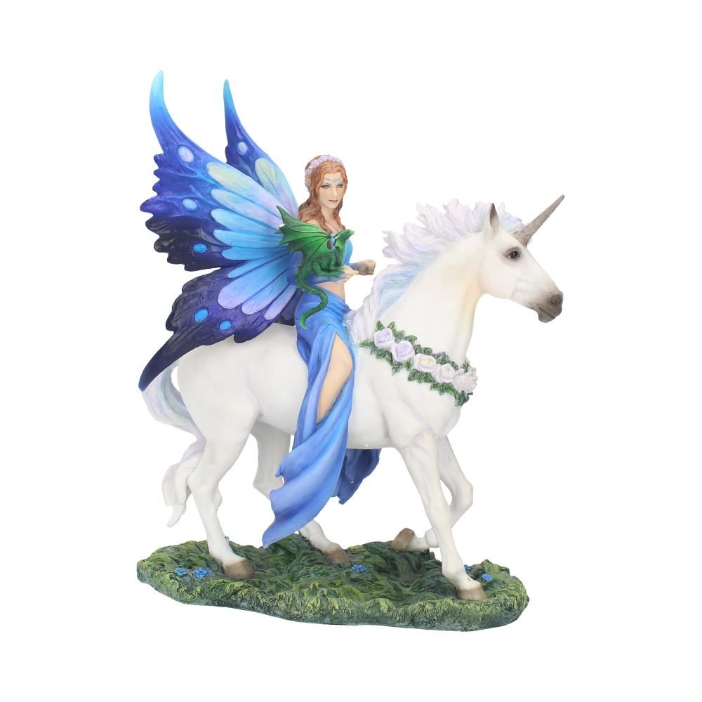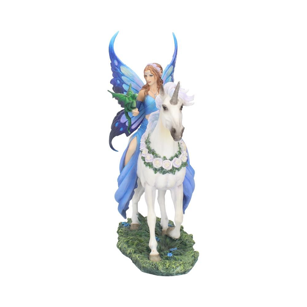 now available as part of Infinitum’s high-quality Premium range of alternative giftware, this magical figurine is designed by internationally famous Fantasy artist Anne Stokes. Walking through the enchanted landscape, a fairy rides atop of her Unicorn companion. This pale, mystical beast has shades of blue and lilac in its pastel mane and wears a garland of roses draped around the base of their neck. The blue of the fae’s dress is as deep as that decorating her butterfly-like wings. Resting on her right wrist is a small Emerald Dragonling, seeking comfort in her touch. Cast in the finest resin before being painstakingly hand-painted, this Fantasy statuette is a wonderful way to add the calm of a magical midsummer to any room.