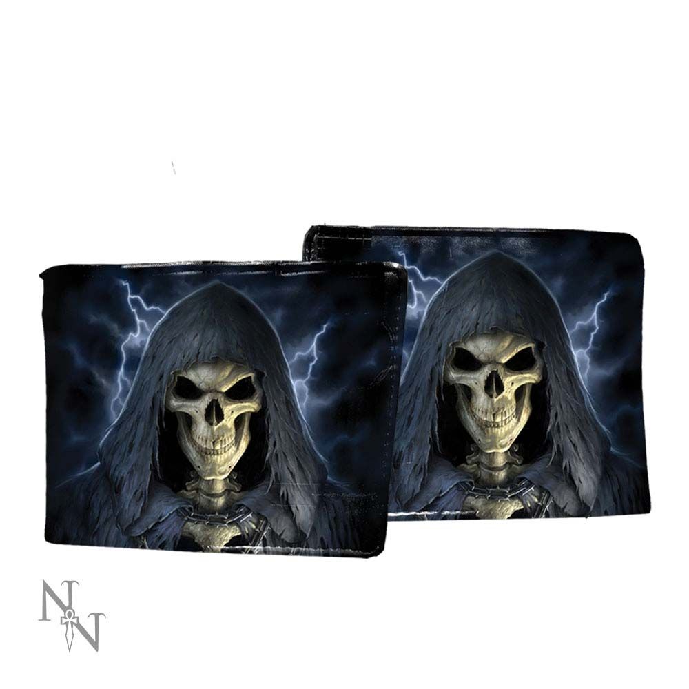 From the dark imagination of globally renowned Gothic Fantasy artist James Ryman, this alternative Wallet is now available through Infinitum. I front of a storm-wracked sky, lit by lightening, this skeleton grins at you macabrely. Their black cowl is held in place with a spiked chain around their neck, and they seem to stare at you as if to say time’s up. The design is repeated on the back. This spacious and stylish Wallet is a great gift for anyone who appreciates the darker things in life, but needs to keep their cash secure.